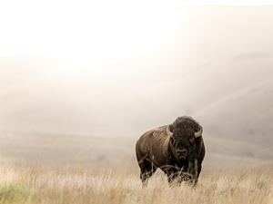 Large bull bison giving a pause to catch his breathe during the rutting season